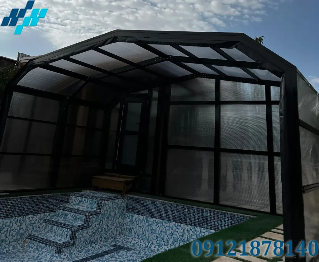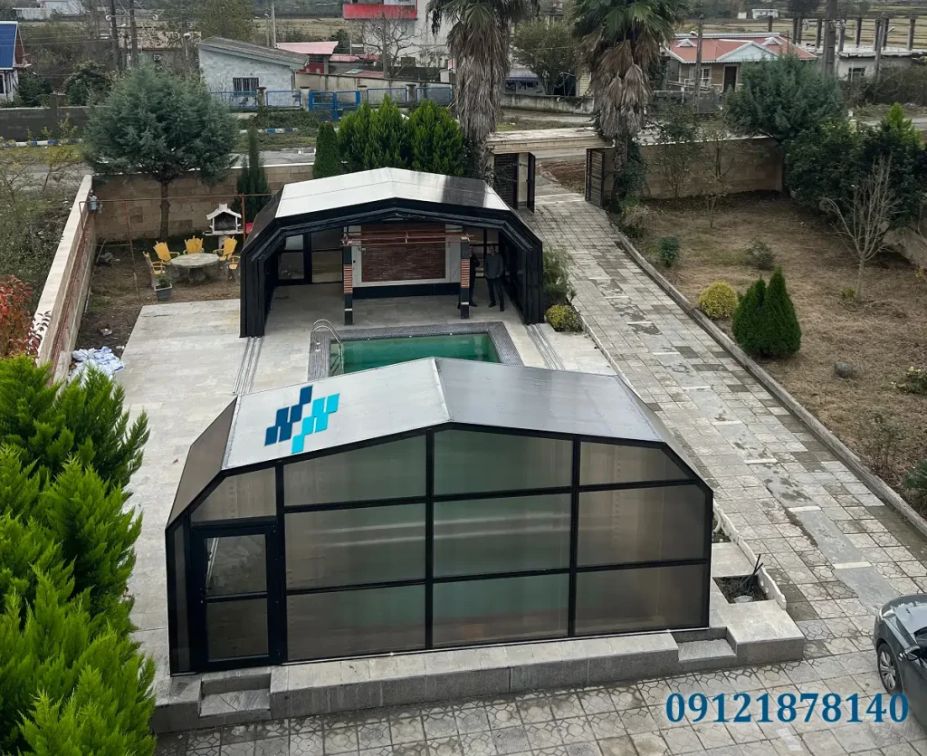 پوششهای تلسکوپی (Telescopic Pool Enclosures): این نوع پوششها از محبوبترین و کارآمدترین گزینهها برای استخرهای خانگی هستند. آنها از پانلهای متحرک ساخته شدهاند که روی ریلها حرکت میکنند و به شما این امکان را میدهند که سقف را به طور کامل باز یا بسته کنید.